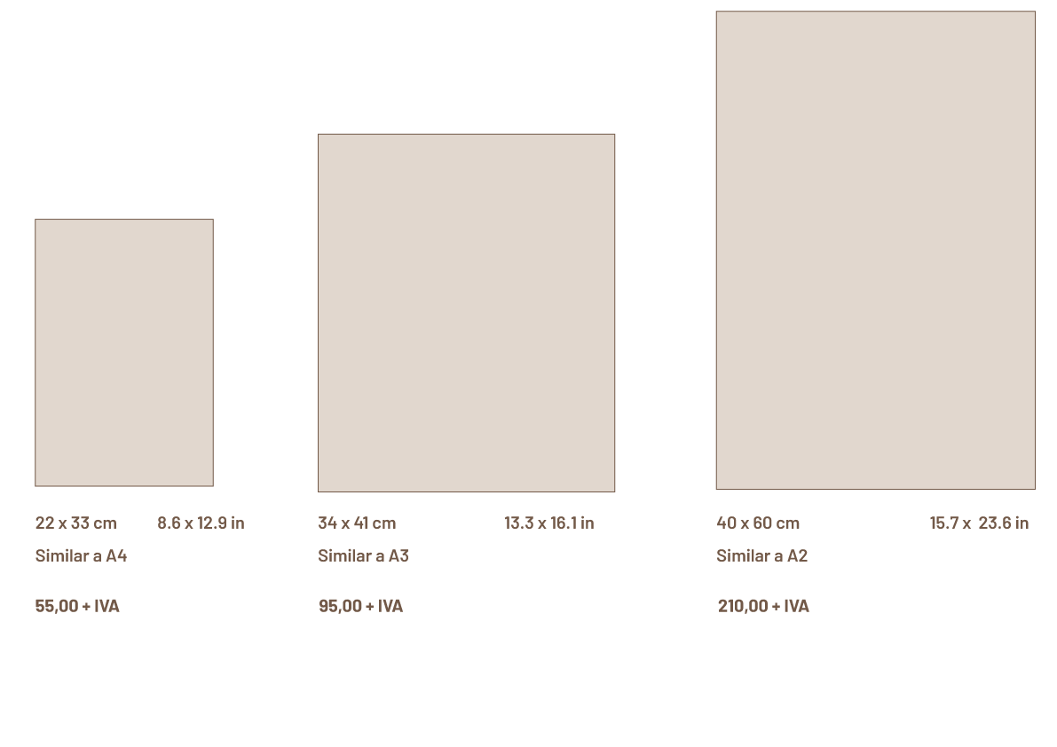 A continuación presentamos algunos de los formatos más comunes en los que realizamos impresiones tipo fine art, utilizando pigmentos de alta calidad y papeles de alta densidad, cuyo acabado recuerda al grabado o a la serigrafía.
